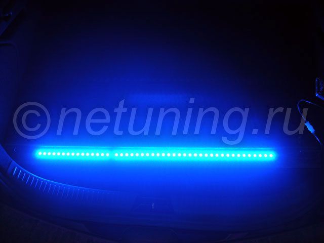 Снимаем полку багажного отделения. Обезжириваем ровную поверхность полки - этим этапом лучше не пренебрегать. Постепенно снимаем защитную полоску с обратной стороны светодиодной ленты и клеим ленту по центру полки хорошенько прижимая ее. На участки ленты между светодиодами можно давить посильнее, на светодиоды - поласковее.