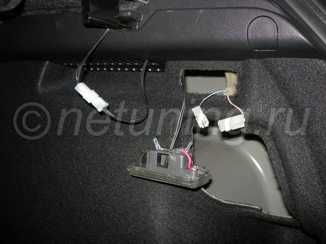 Прячем все провода за обшивку, подключаем фонарь, вставляем его обратно (сначала ту сторону, где нет металлической защелки), закрываем окошко. В сборе все выглядит вполне аккуратно.